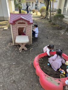 自然豊かな庭でドングリ拾ったり、枯れ葉を拾って遊びました。